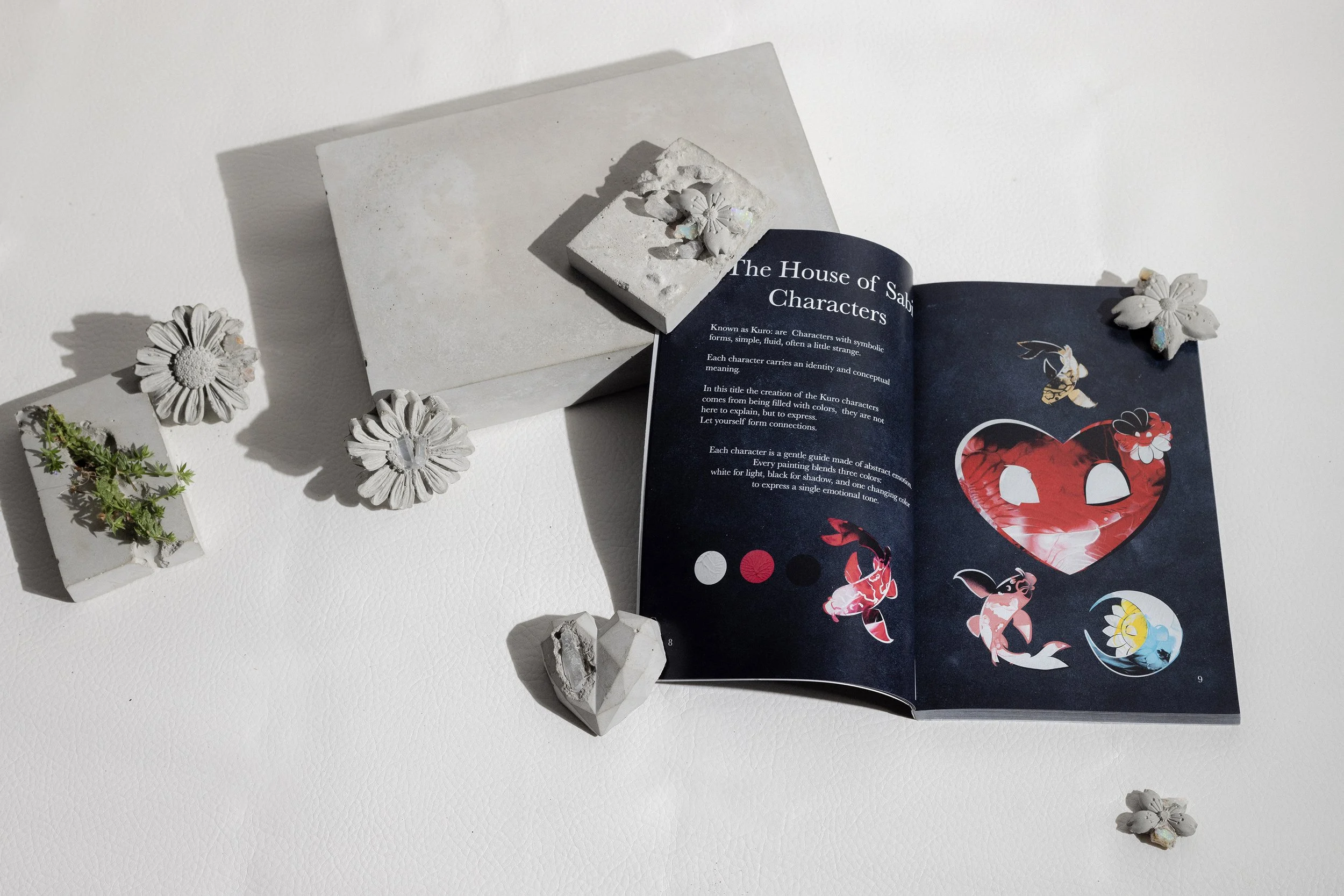 Each chapter opens with the color and what it holds. The abstract paintings and the Kuro characters that accompany them carry the same three colors: white for light, black for shadow, and one changing tone that names the emotional state of that chapter.